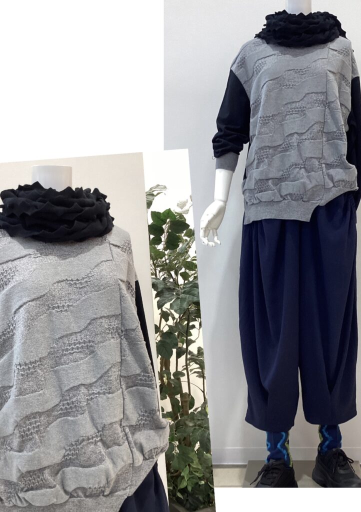 中に着ているのは、綿×ウールの杢糸を使い、プレーティングで立体的なリンクス編みが素敵なニット♡こちらは、ニットとカットソーの組み合わせで、カジュアルスタイリングにピッタリです✨