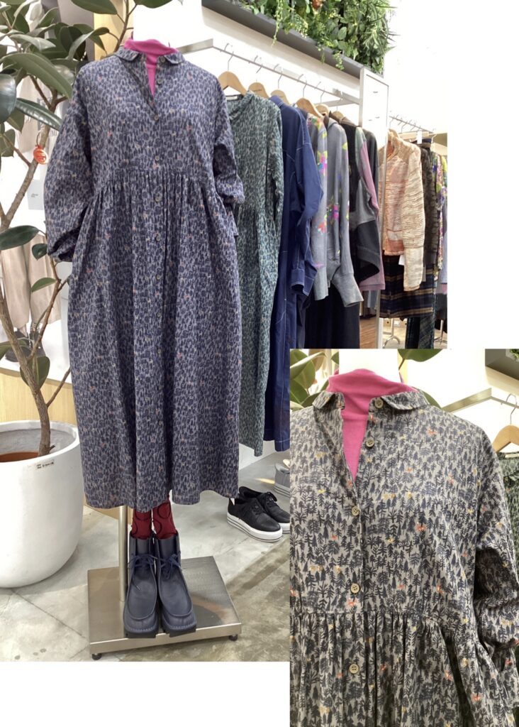 先ずはこちら、森の仲間たちがプリントされたふんわりソフトな肌触りの綿ローンワンピース。チビ襟と胸下の切り替えギャザーで可愛らしさUP♡