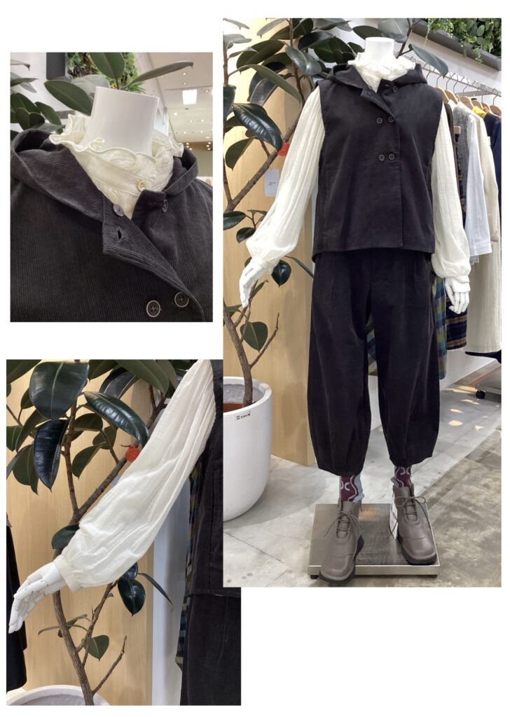 合わせたブラウスは、柔らかく暖かなガーゼ素材。