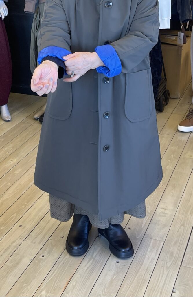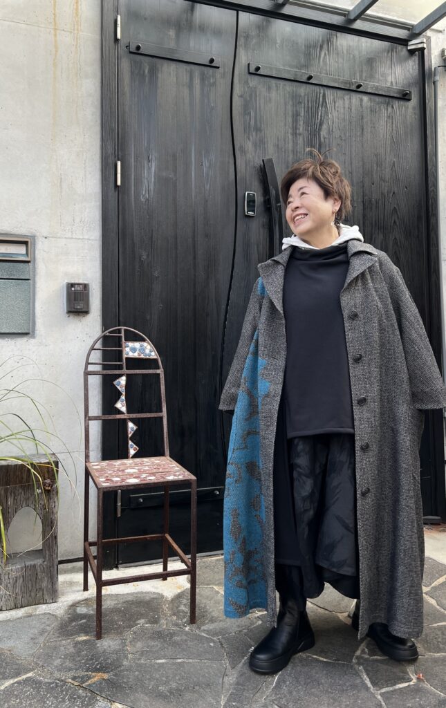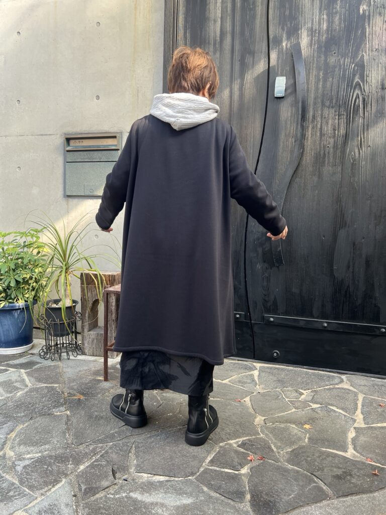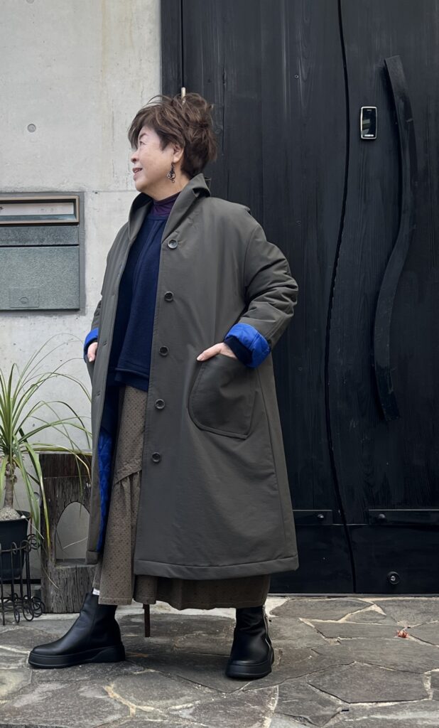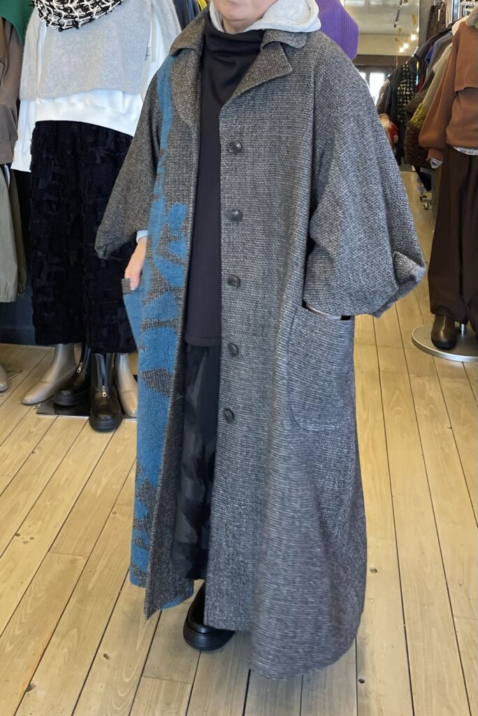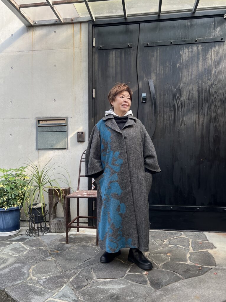 コートは「慈雨」の尾州で織られた、いちょうのモチーフのある