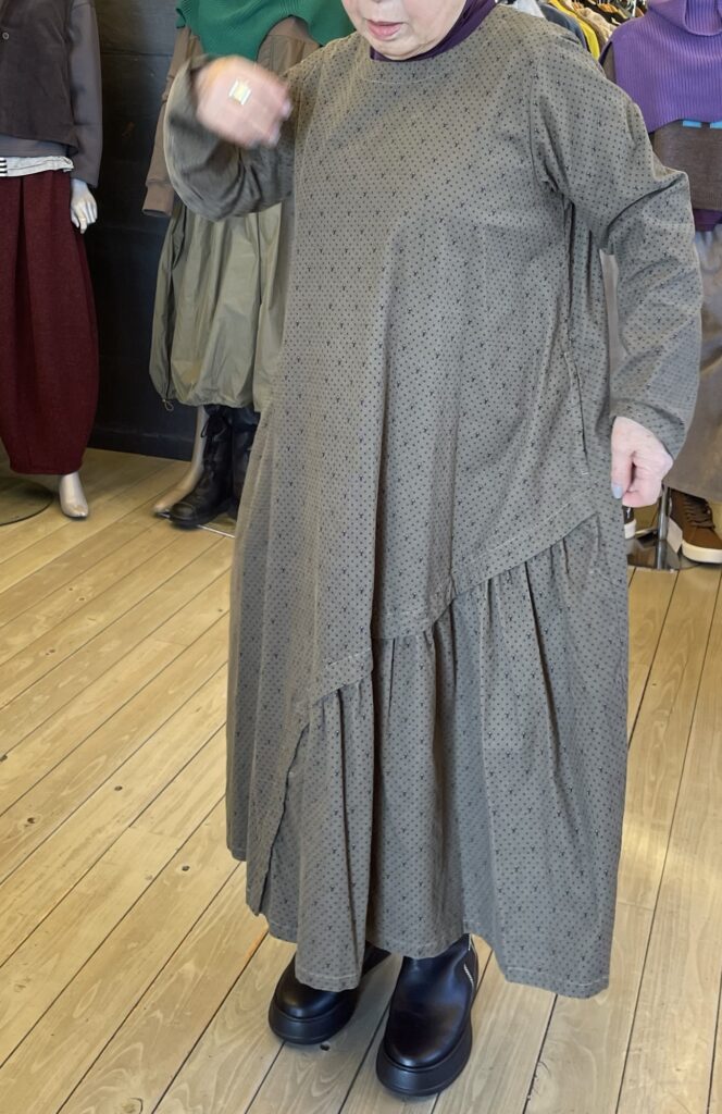 コーデュロイのワンピースとパンツも素朴な感じなので