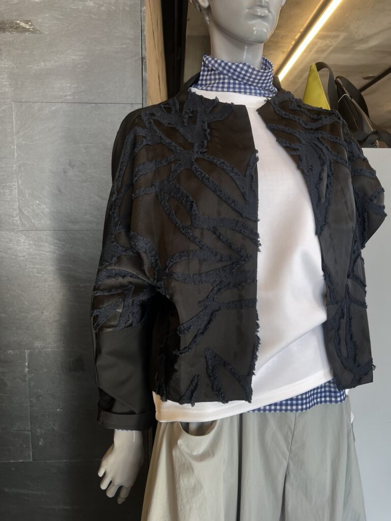 光沢感とフリンジ加工のジャケットで「ちょっとよそいき感」を演出