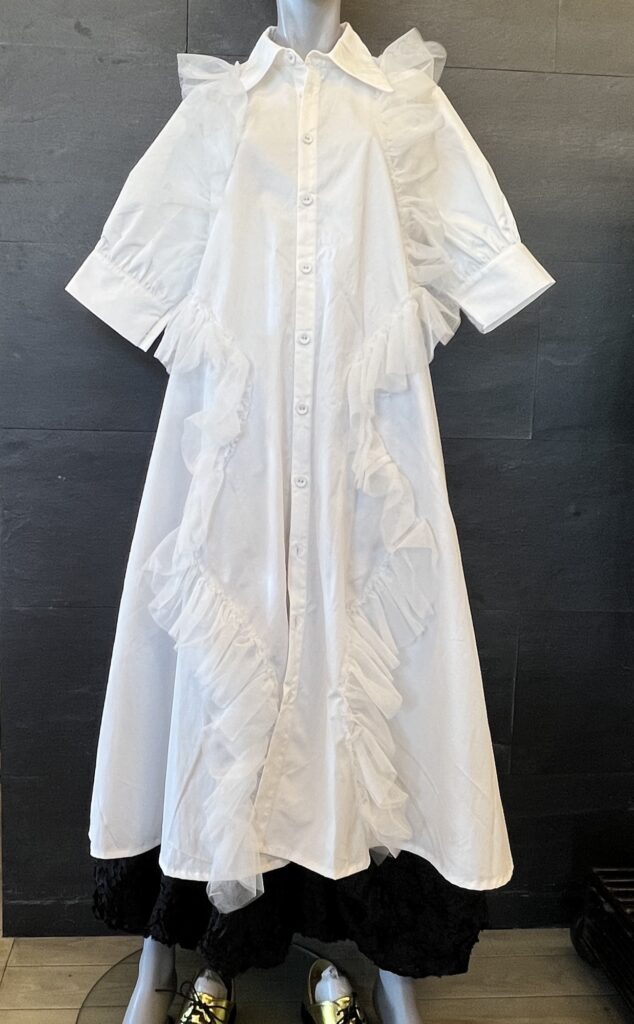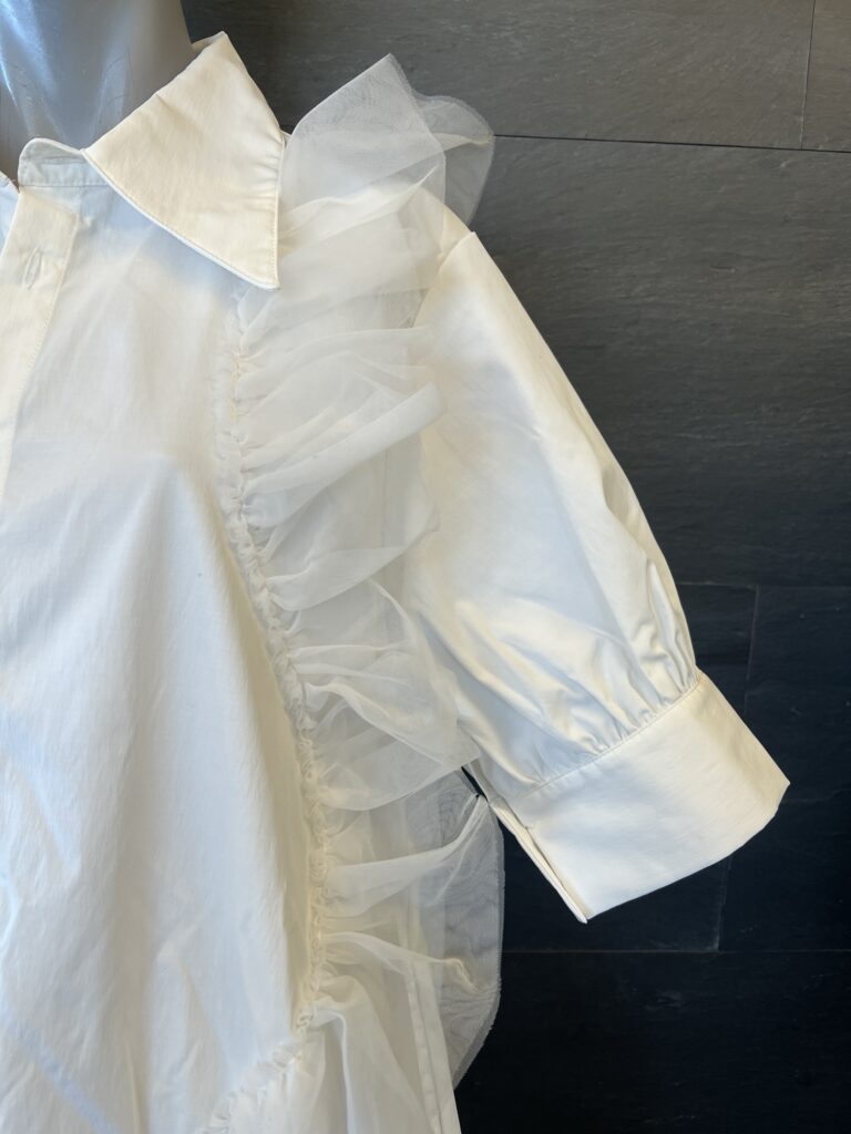 シャープさのあるタフタ素材のオーガンジーのフェミニンさを加えた