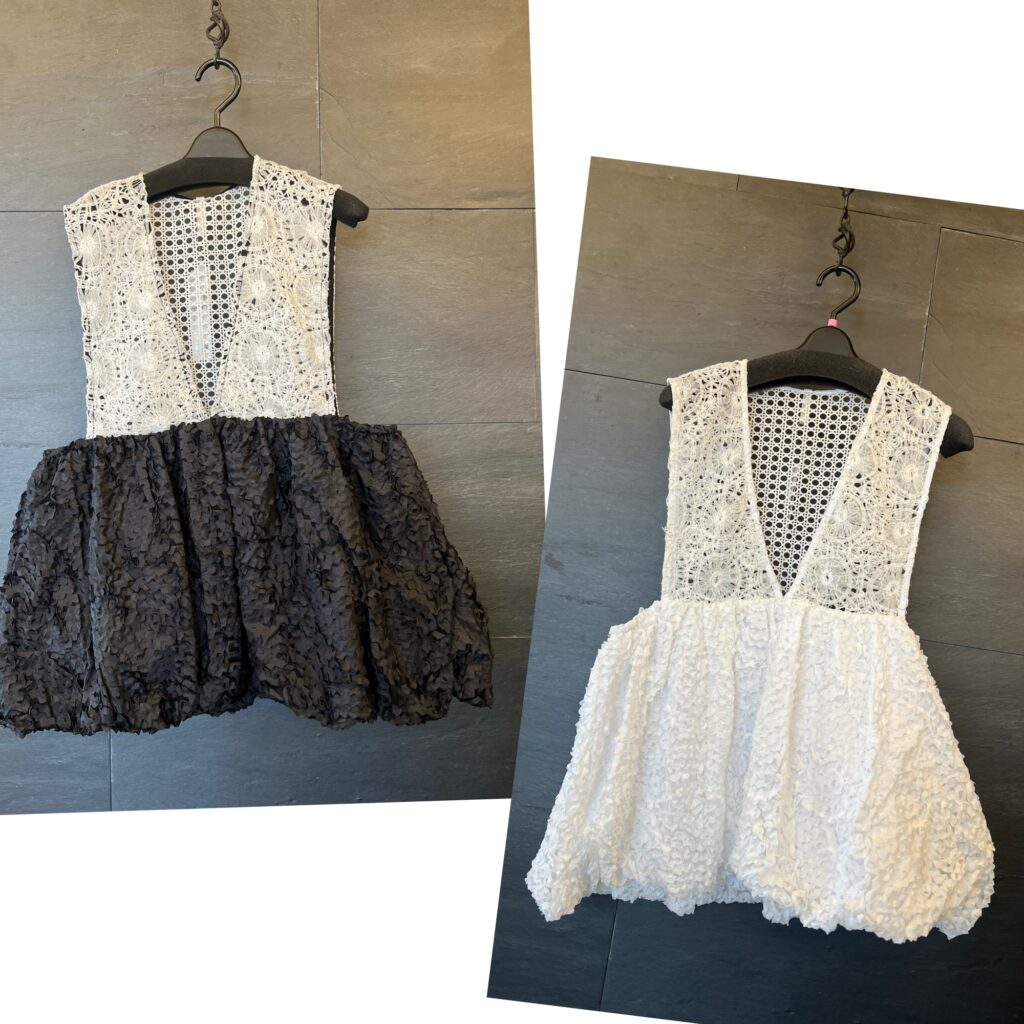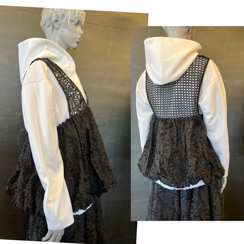 シャープさのあるタフタ素材のオーガンジーのフェミニンさを加えた