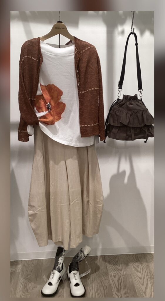 大胆な花柄×茶系の落ちついたカーディガン 幅広パンツと✨